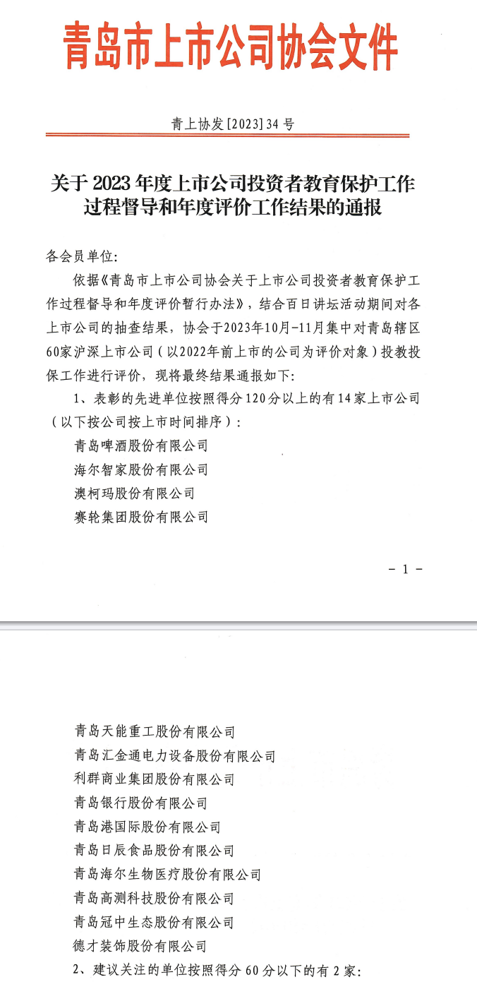 开云网页版·官方版在线登入荣获“2023年度青岛投资者保护工作先进单位”